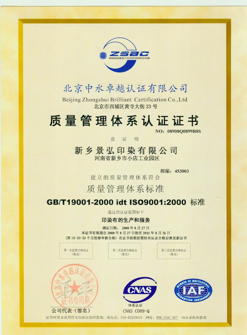 質(zhì)量管理體系認(rèn)證證書